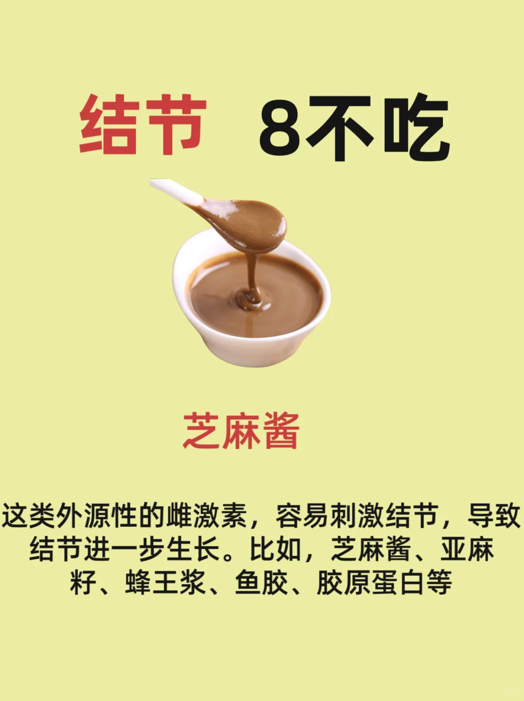 芝麻酱这类外源性的雌激素,容易ci激结节,导致结节进一步sheng长。比如,芝麻酱、亚麻籽、蜂王浆、鱼胶、胶原蛋白等辣条烧烤以及袋装垃圾食品都是不能吃的,这些属于辛辣刺激的食物会刺激结节薯条薯条、炸鸡汉堡、煎炸食物以及老火靓汤都属于高脂油腻的食物,影响人体正常xiao hua,会促进结节进一步恶化...