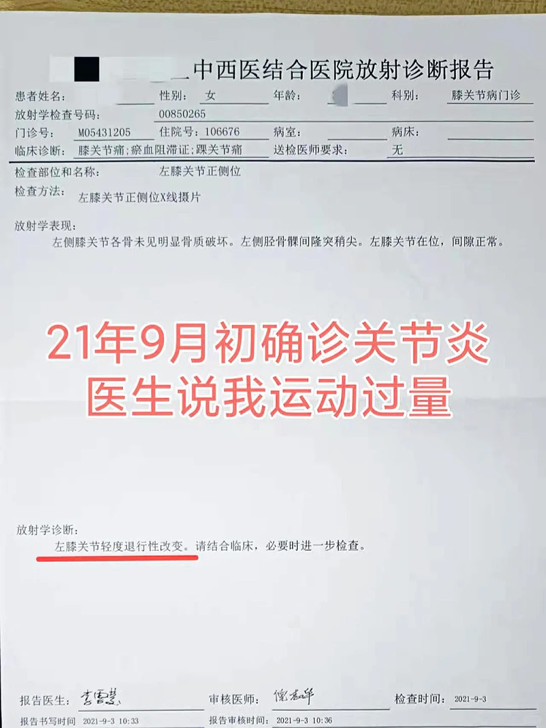 我去年4月开始运动瘦身,每天也就是在跑步机上快走40分钟,顶多再加几分钟高抬腿、开合跳等这些小运动。 前期我确实靠这些有氧运动加饮食结构调整,减掉了一些小肚子。 不过直到去年9月,左膝盖突然有钝痛感,去医院拍片子后,医生竟说我运动过量,外加多囊导致雌激素偏低产生了骨质问题。 怪不得我每天这么点运动量...